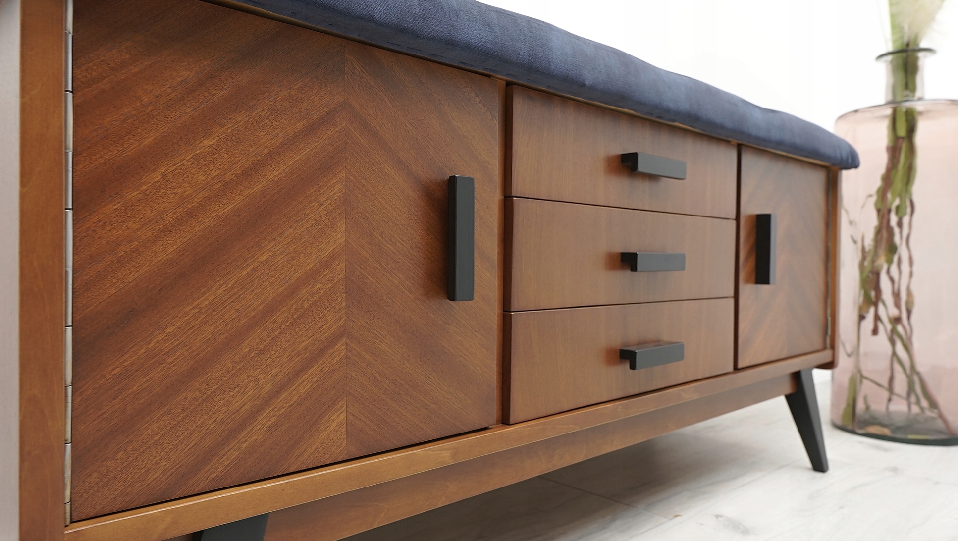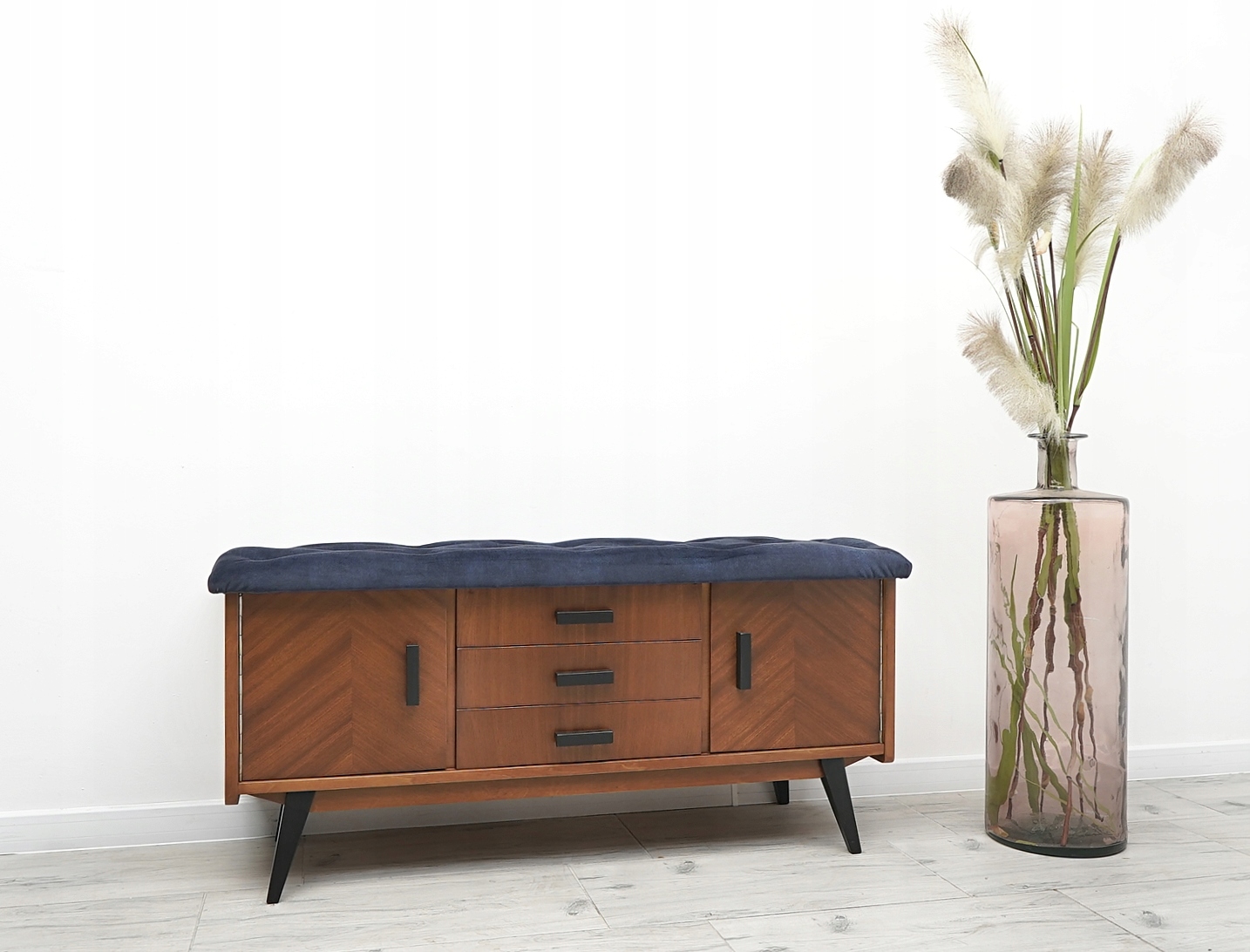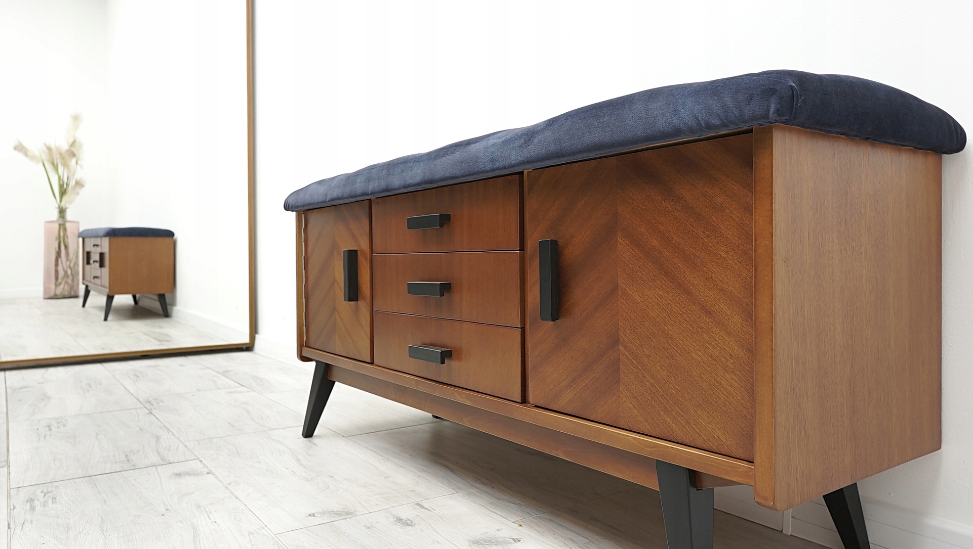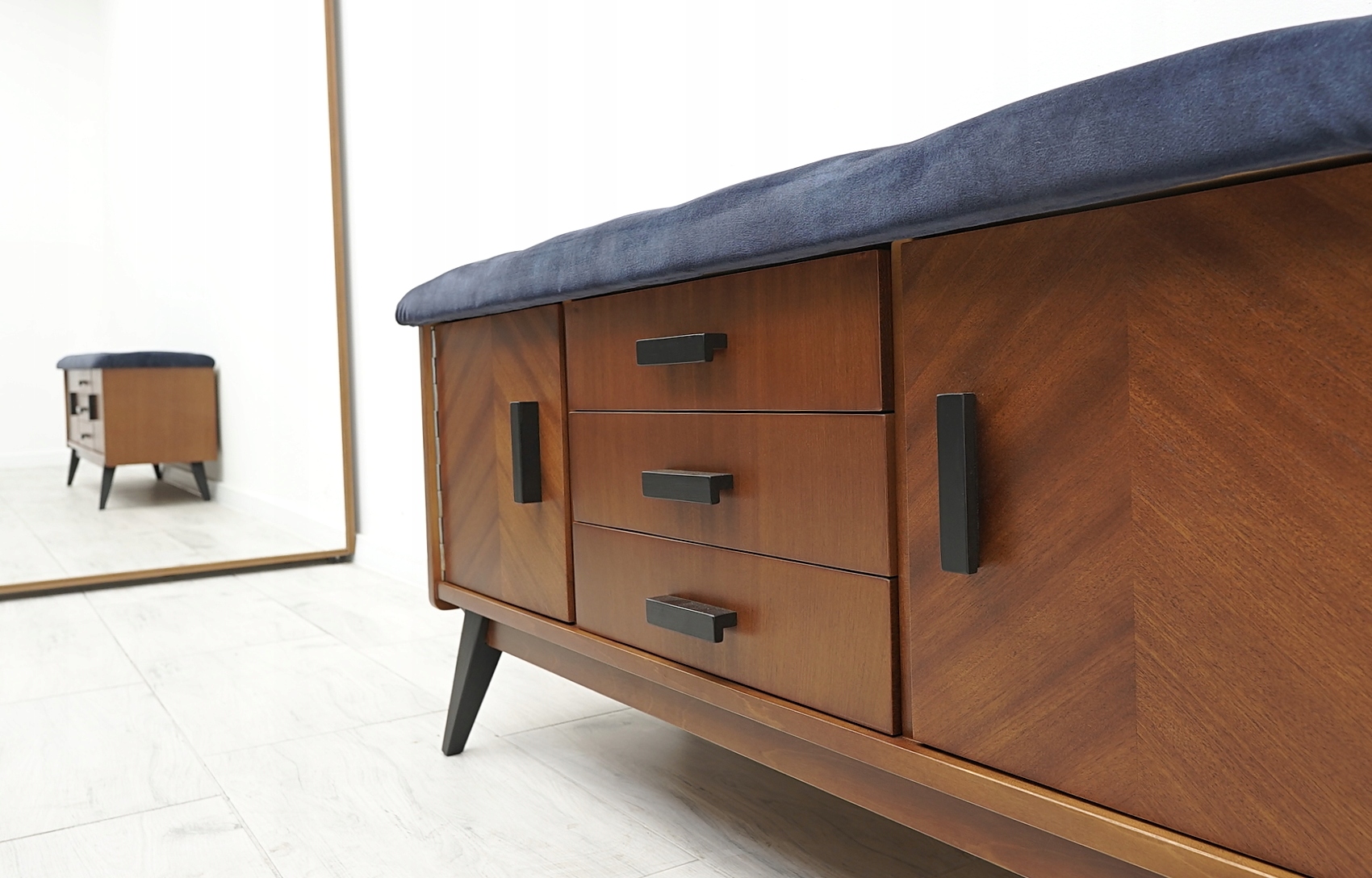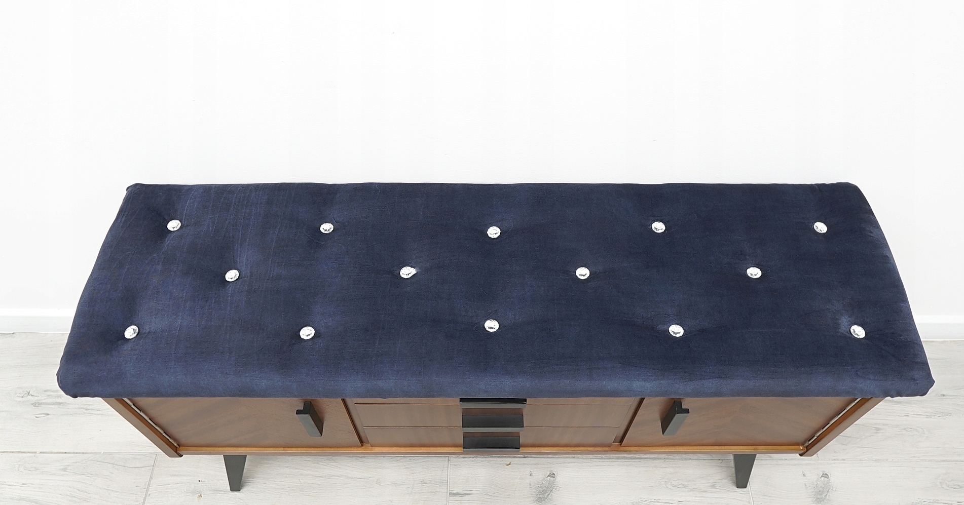 Komoda posiada oryginalną fabryczną metkę. Jest to wyjątkowy i niepowtarzalny mebel, który w tej wersji może pełnić również funkcję siedziska. W tym celu blat komody został pokryty miękką gąbką i obity materiałem welurowym najwyższej jakości w odcieniu głębokiego granatu. Zastosowane pikowania w postaci kryształowych guzików na siedzisku nadają komodzie jeszcze większego charakteru, elegancji i stylu. Zachęcamy do jej zakupu. Jest to mebel, który z pewnością urządzi każde, nawet najbardziej wymagające