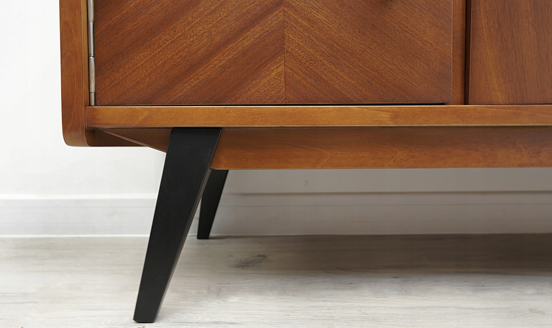 W tej ofercie chcielibyśmy zaprezentować Państwu designerską komodę z 1968 roku, wykonaną z drewna orzechowego i sklejki w kultowej Spółdzielni Pracy Stolarzy Meblostyl w Dobrodzieniu. Komoda jest okleinowana pięknie usłojonym fornirem orzechowym (mansonia). Posiada trzy pojemne szuflady pośrodku oraz dwie pakowne szafki po bokach. Mebel przeszedł profesjonalną renowację w naszej stolarni.
