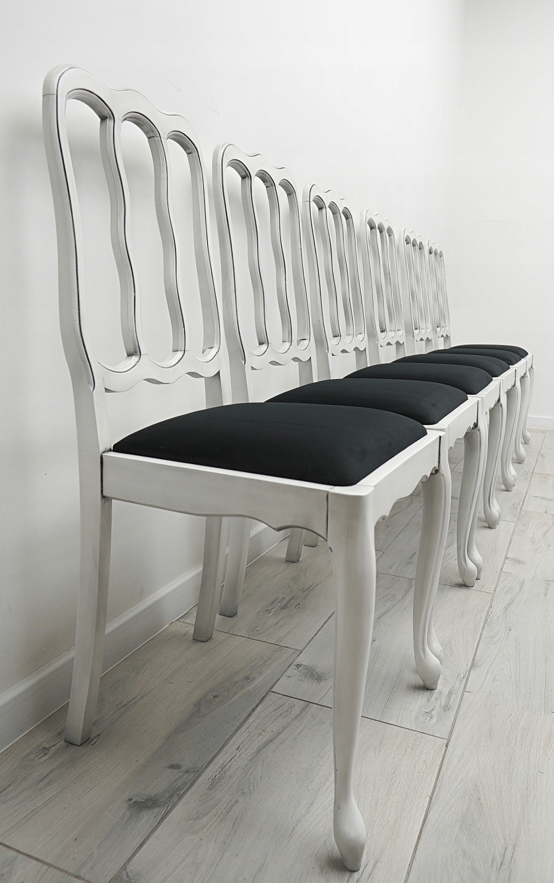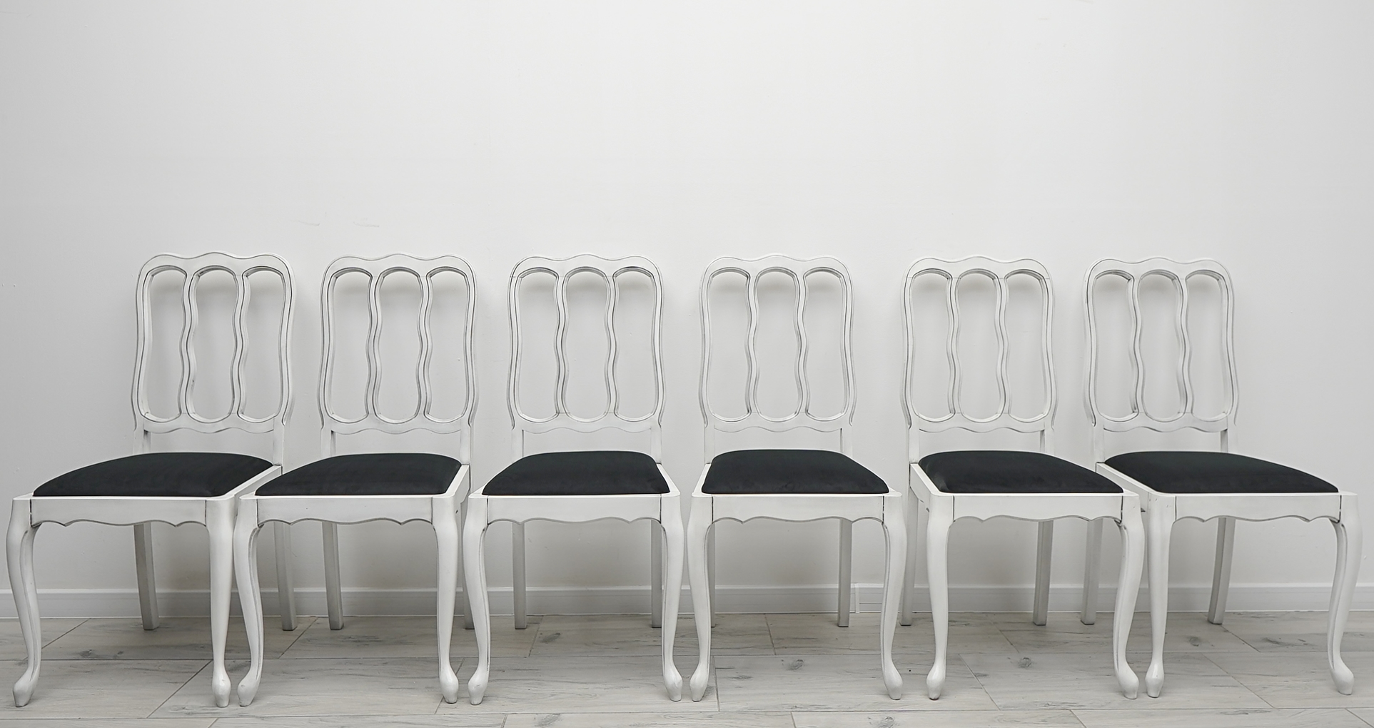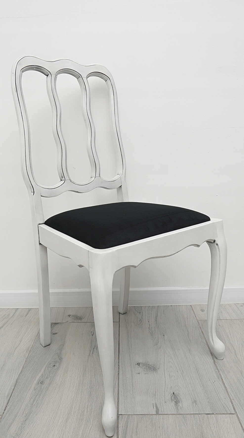 - Krzesła są z nowymi pasami oraz nowym obiciem, wykonanym z wysokiej jakości materiału welurowego, w kolorze czarnym.