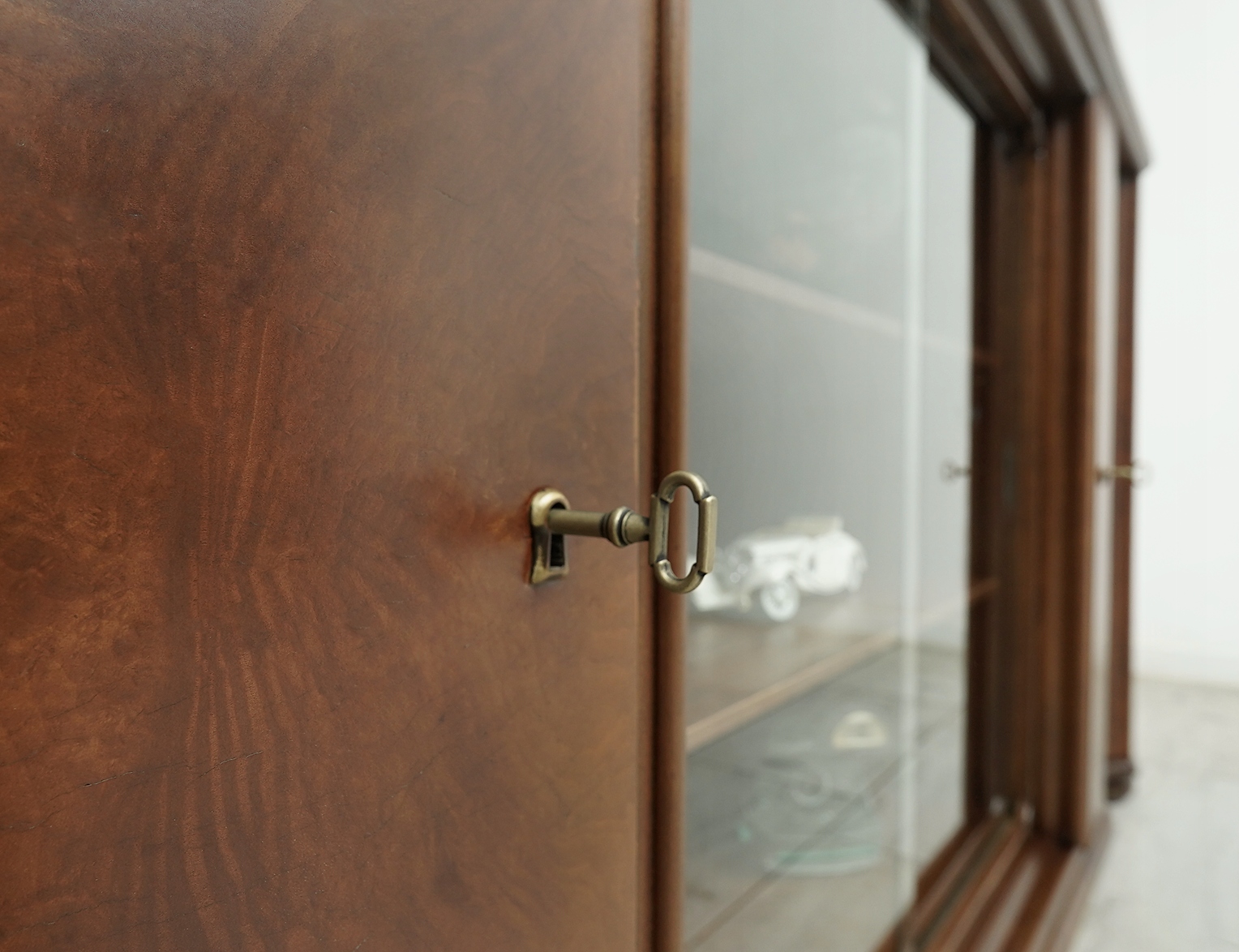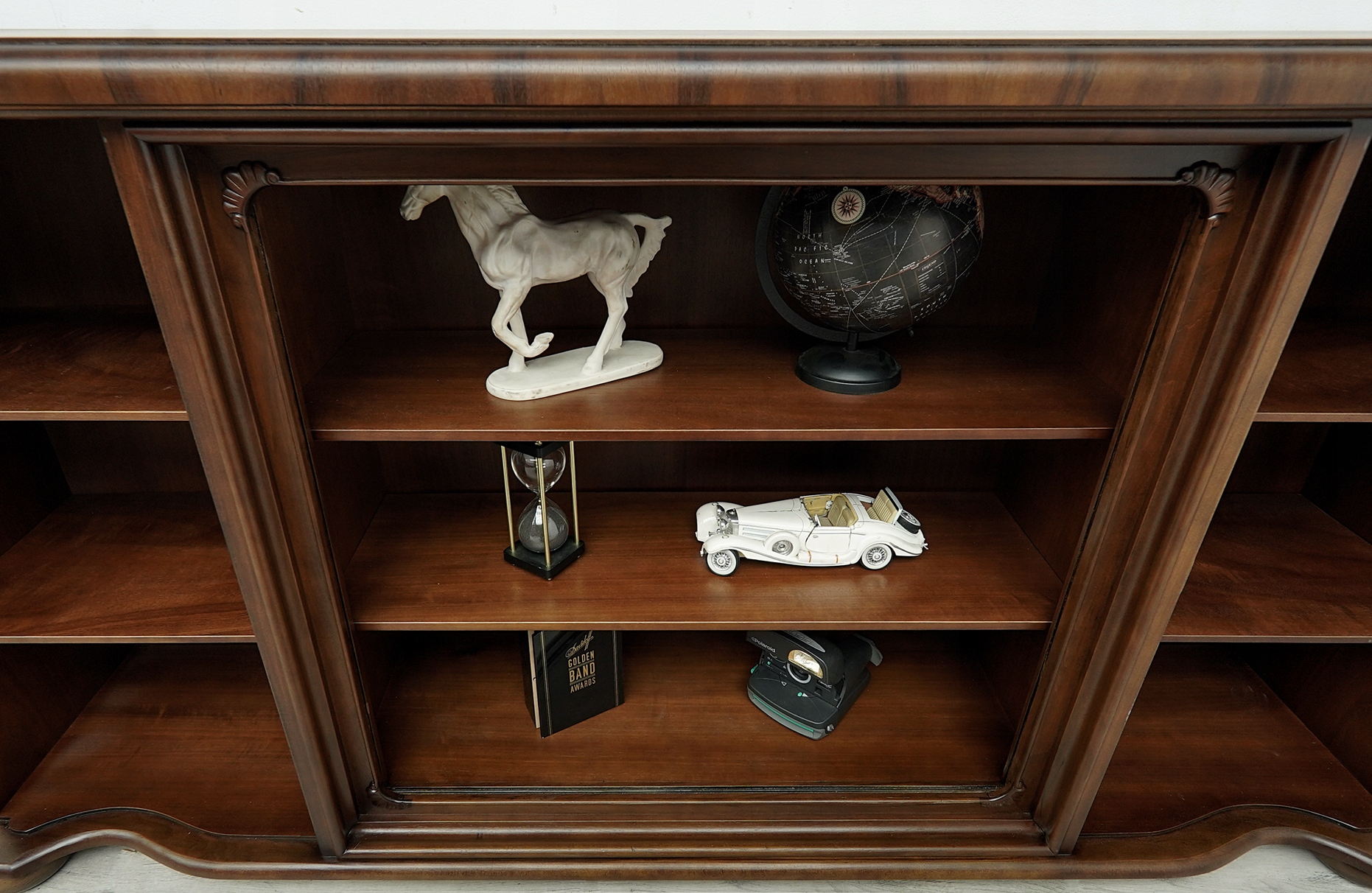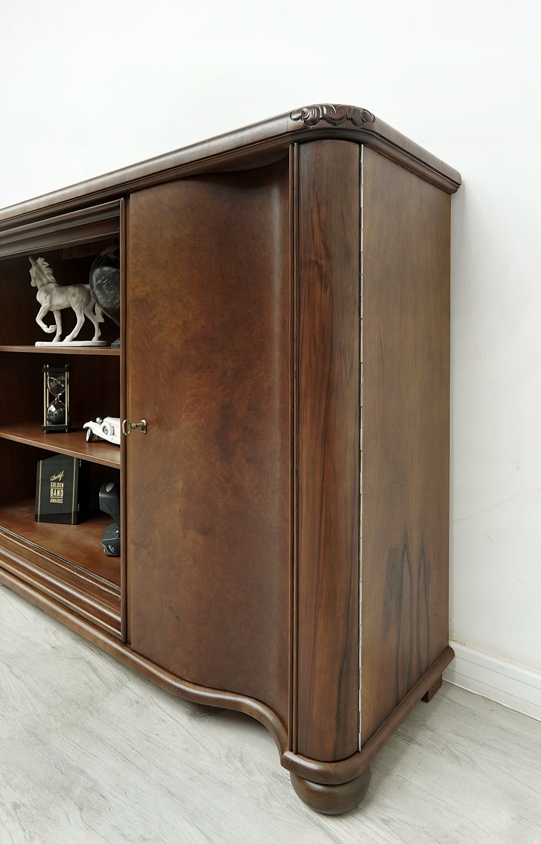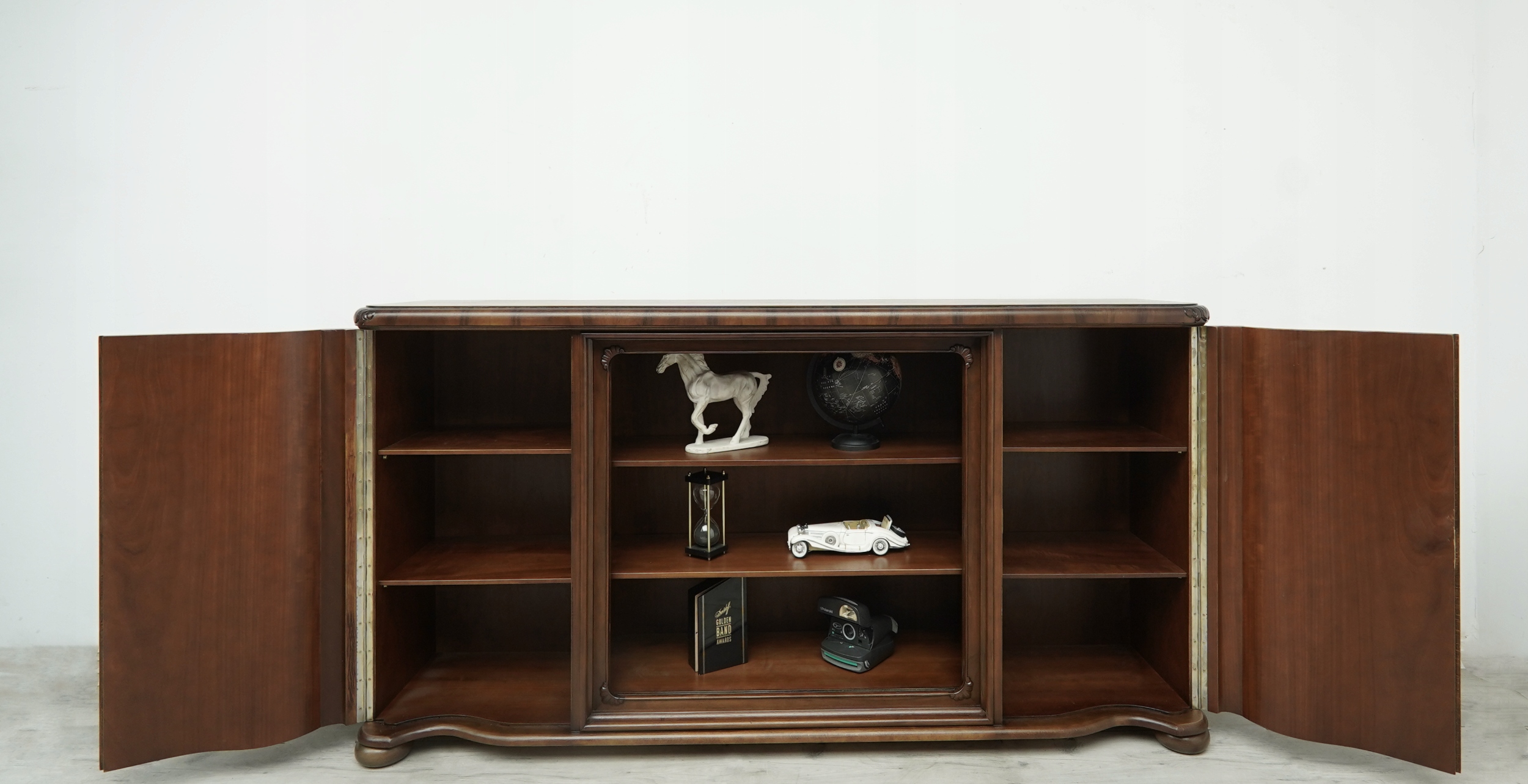 Biblioteka wykonana jest z połączenia drewna orzechowego i dębowego (na blacie). Przeszklone wnętrze sprawia, że mebel prezentuje się bardzo elegancko i stylowo. Wyjmowane szyby dają możliwość ekspozycji przedmiotów w zamkniętej, przeszklonej lub otwartej, ogólnodostępnej przestrzeni a zamykane na klucz szafki z półkami pozwalają na przechowywanie tego, co do ekspozycji niewskazane. Jest to niezwykle funkcjonalny i pakowny mebel o ponadczasowym charakterze, który urządzi każde, nawet najbardziej wymagające wnętrze.