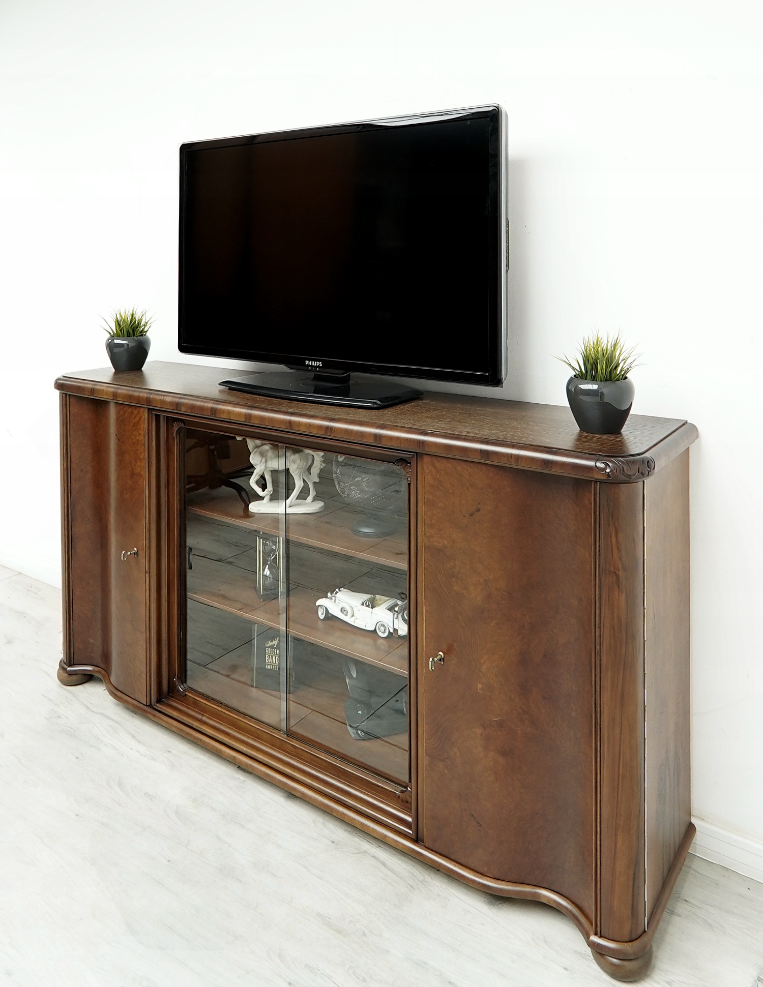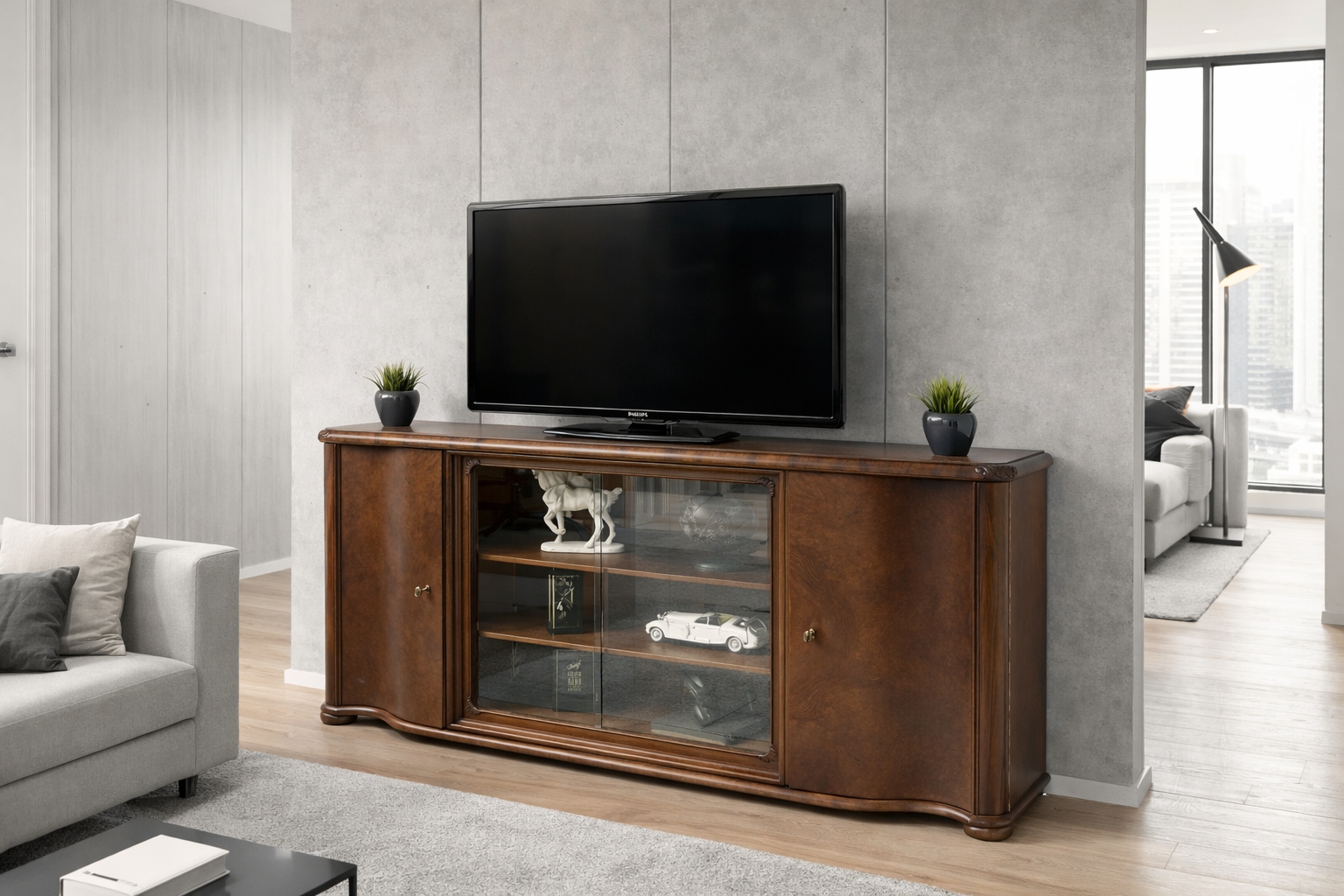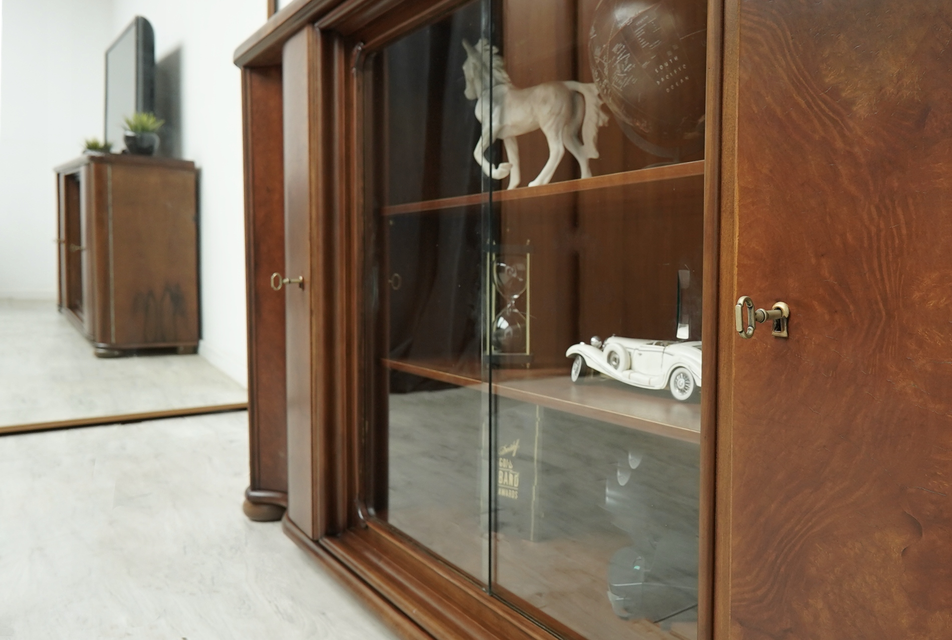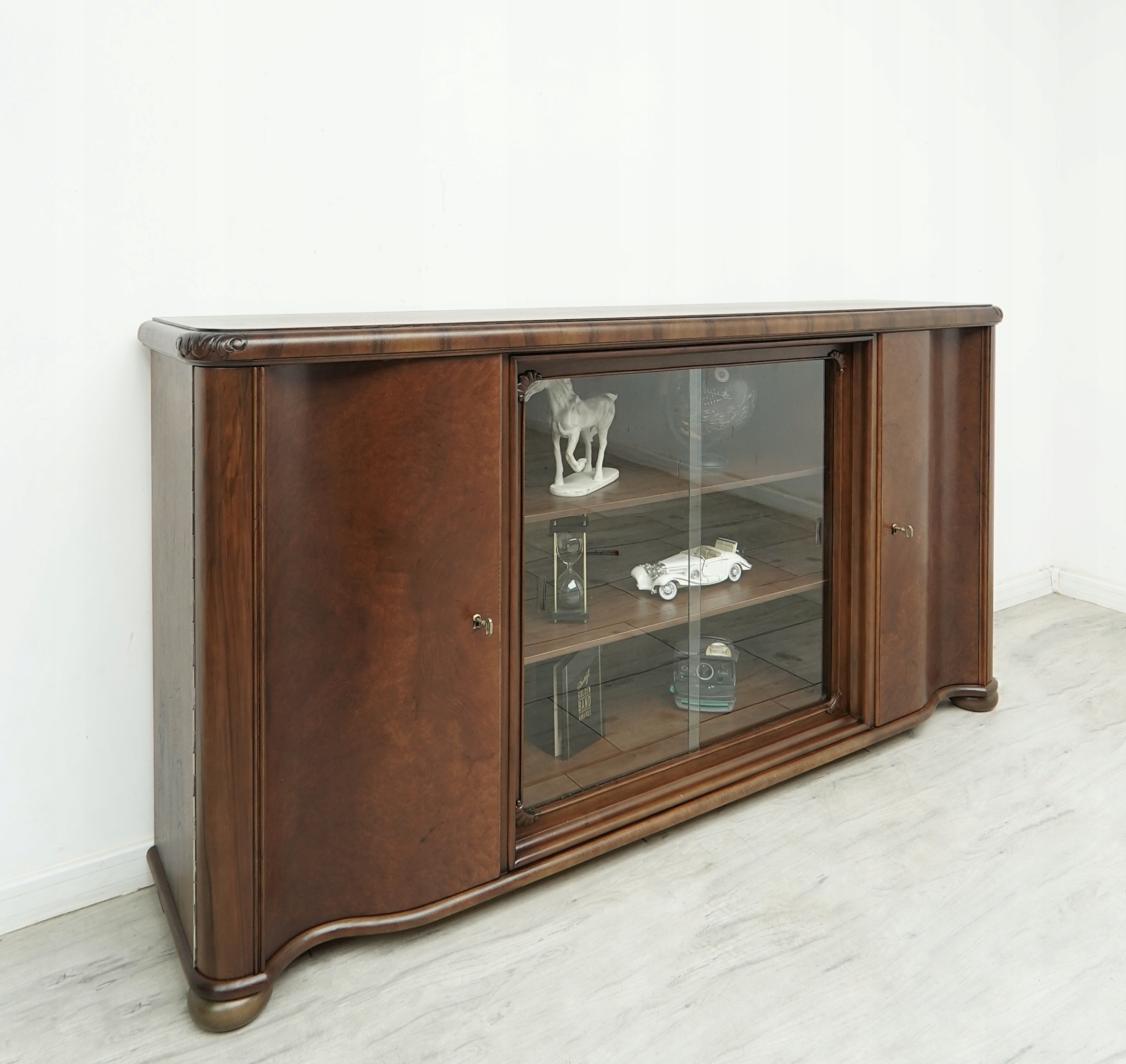Biblioteka wykonana jest z połączenia drewna orzechowego i dębowego (na blacie). Przeszklone wnętrze sprawia, że mebel prezentuje się bardzo elegancko i stylowo. Wyjmowane szyby dają możliwość ekspozycji przedmiotów w zamkniętej, przeszklonej lub otwartej, ogólnodostępnej przestrzeni a zamykane na klucz szafki z półkami pozwalają na przechowywanie tego, co do ekspozycji niewskazane. Jest to niezwykle funkcjonalny i pakowny mebel o ponadczasowym charakterze, który urządzi każde, nawet najbardziej wymagające wnętrze.