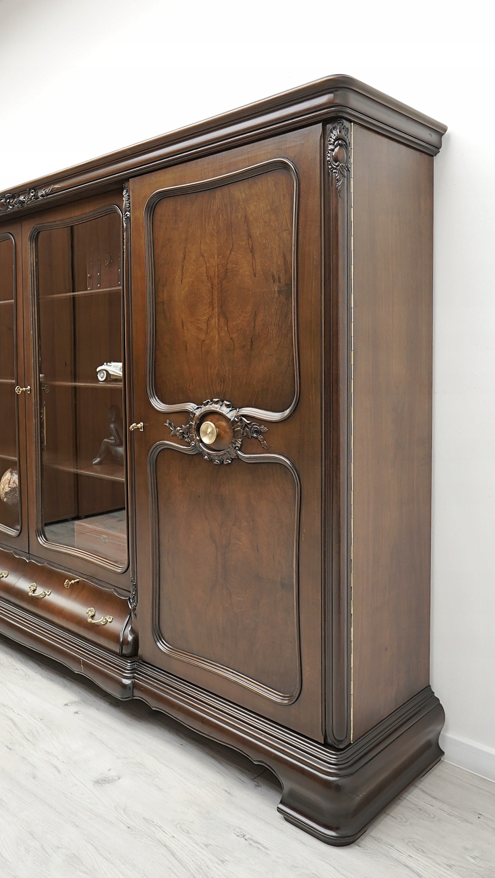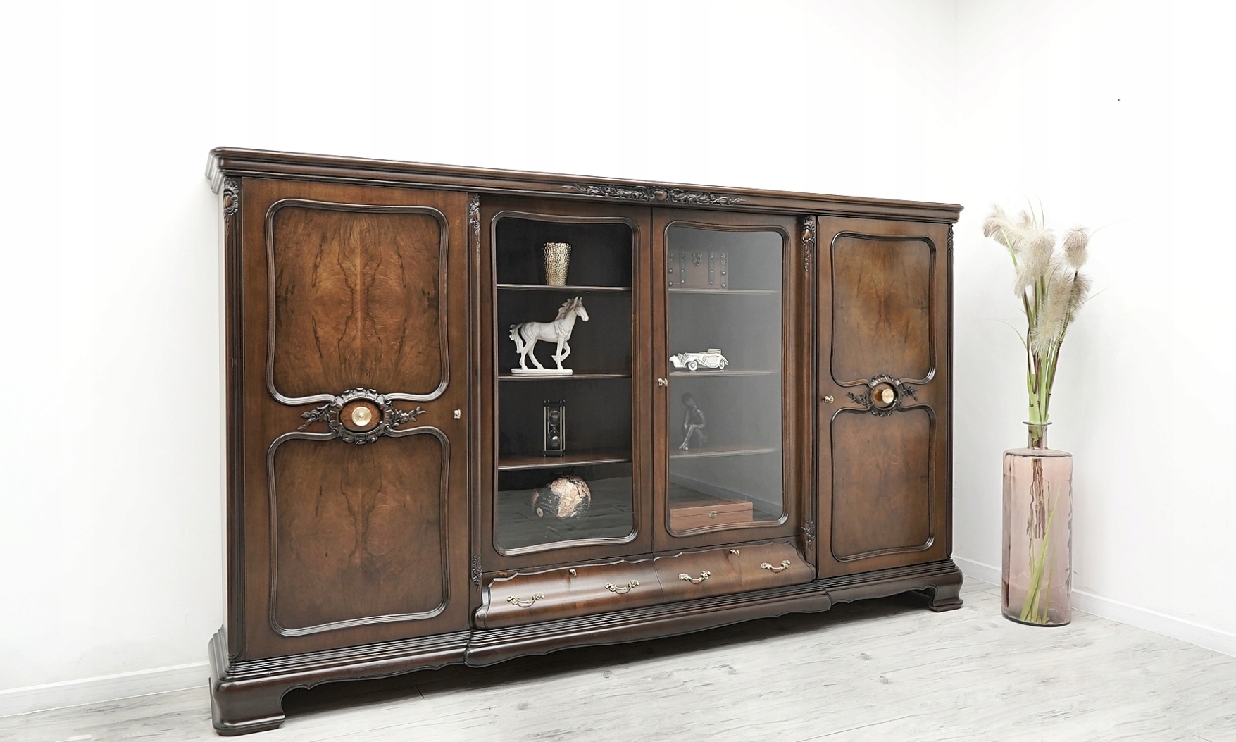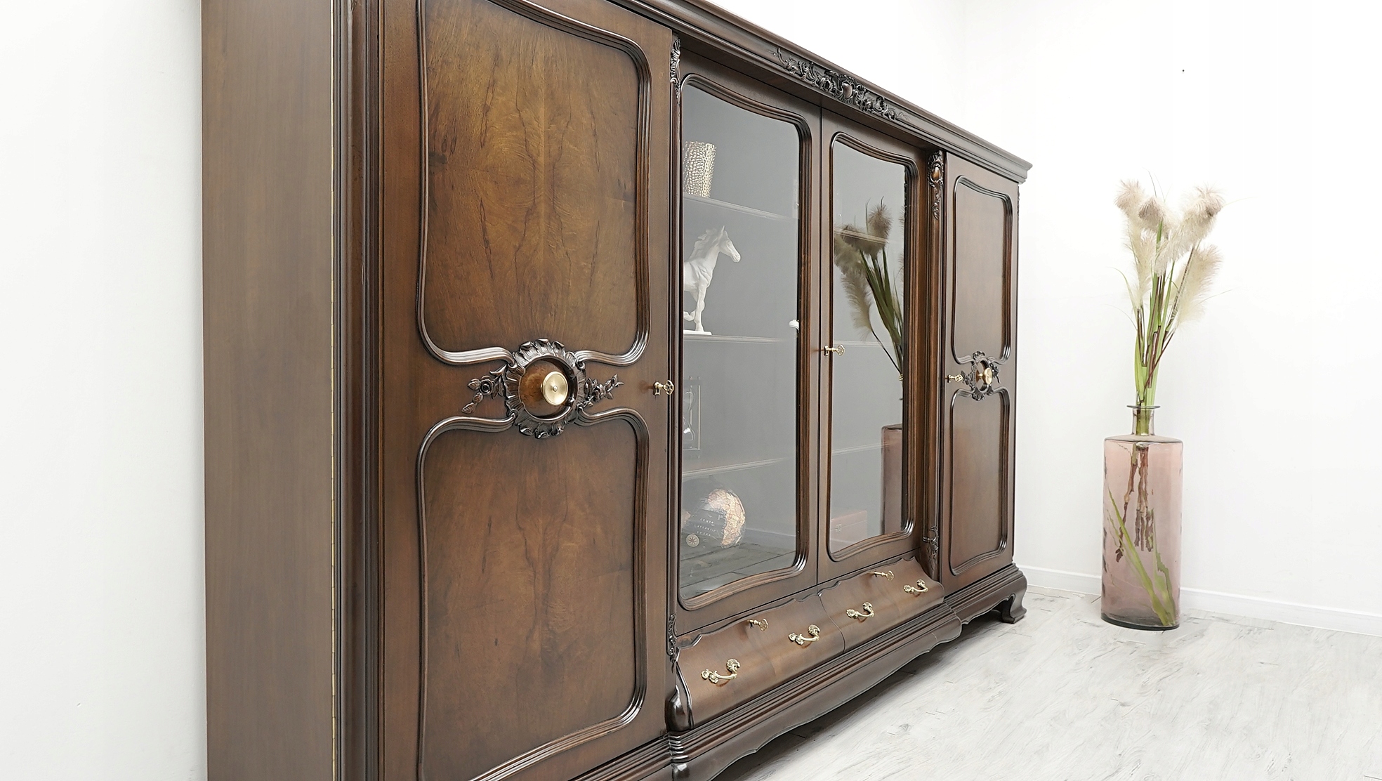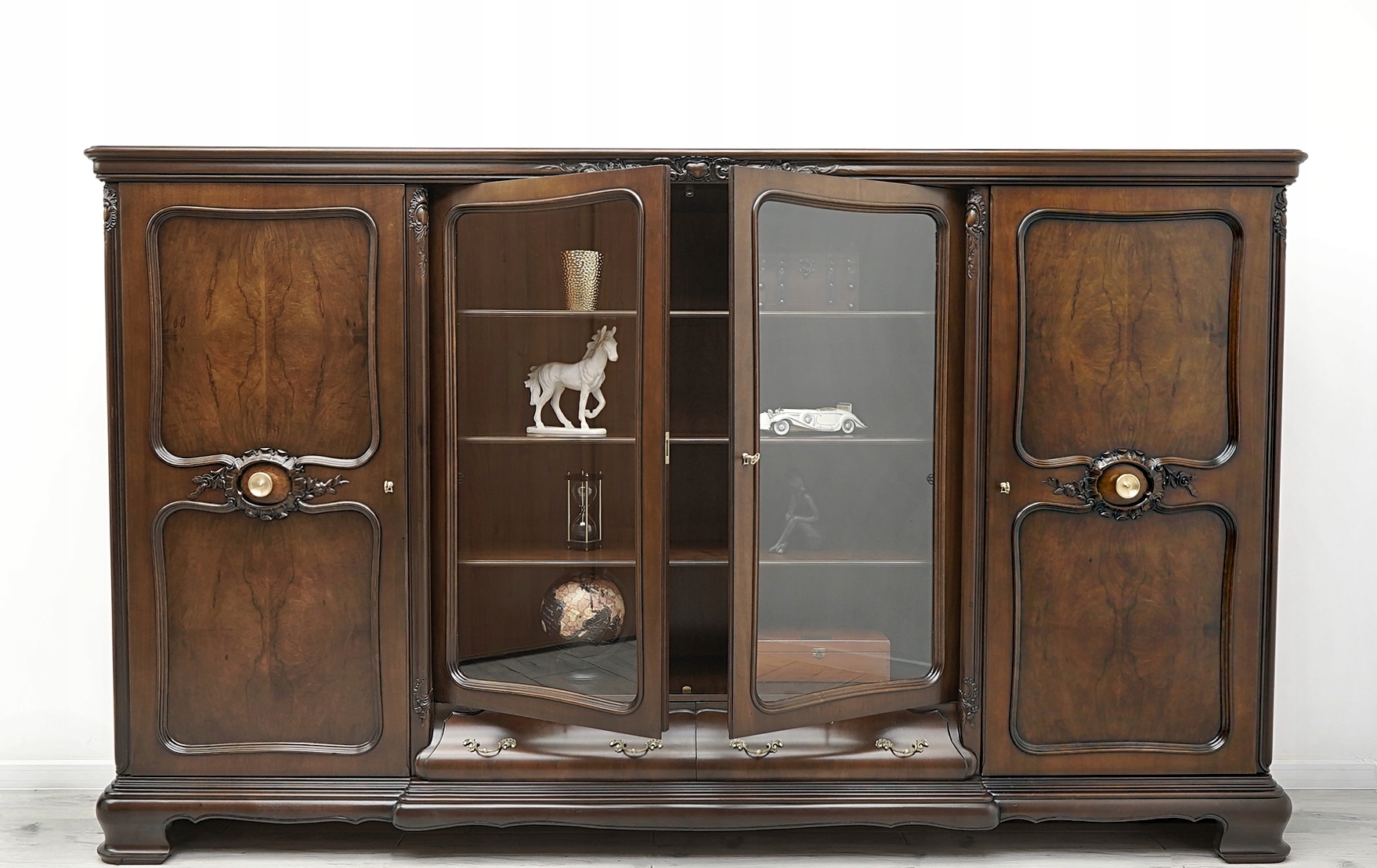 Zachęcamy do jej zakupu. Jest to wyjątkowy i niepowtarzalny mebel, który urządzi każde, nawet najbardziej wymagające wnętrze. Charakteryzuje się pięknym, naturalnym usłojeniem drewna oraz bogatymi rzeźbionymi zdobieniami. Jest bardzo pojemna a dzięki dużemu przeszkleniu i złotym okuciom prezentuje się bardzo elegancko i szykownie, co nadaje jej ponadczasowego charakteru i wysokiego prestiżu.