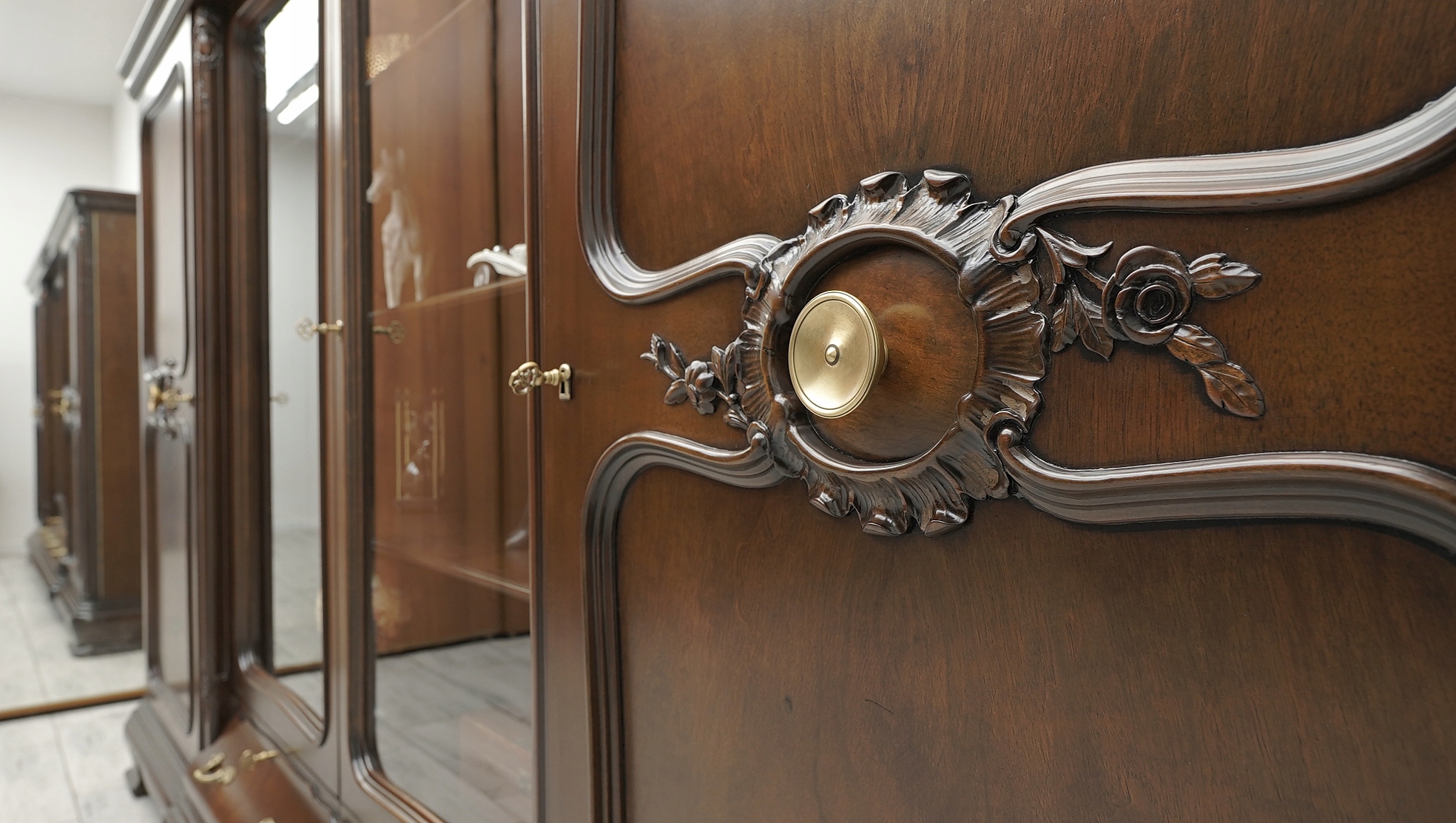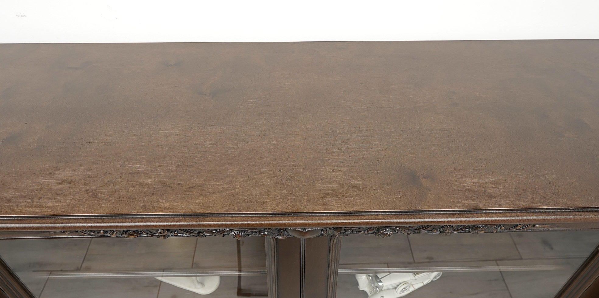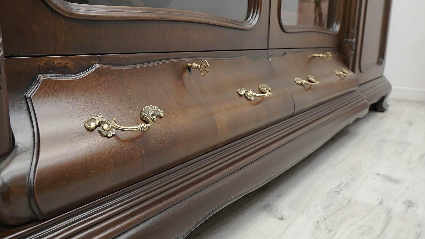 Zachęcamy do jej zakupu. Jest to wyjątkowy i niepowtarzalny mebel, który urządzi każde, nawet najbardziej wymagające wnętrze. Charakteryzuje się pięknym, naturalnym usłojeniem drewna oraz bogatymi rzeźbionymi zdobieniami. Jest bardzo pojemna a dzięki dużemu przeszkleniu i złotym okuciom prezentuje się bardzo elegancko i szykownie, co nadaje jej ponadczasowego charakteru i wysokiego prestiżu.