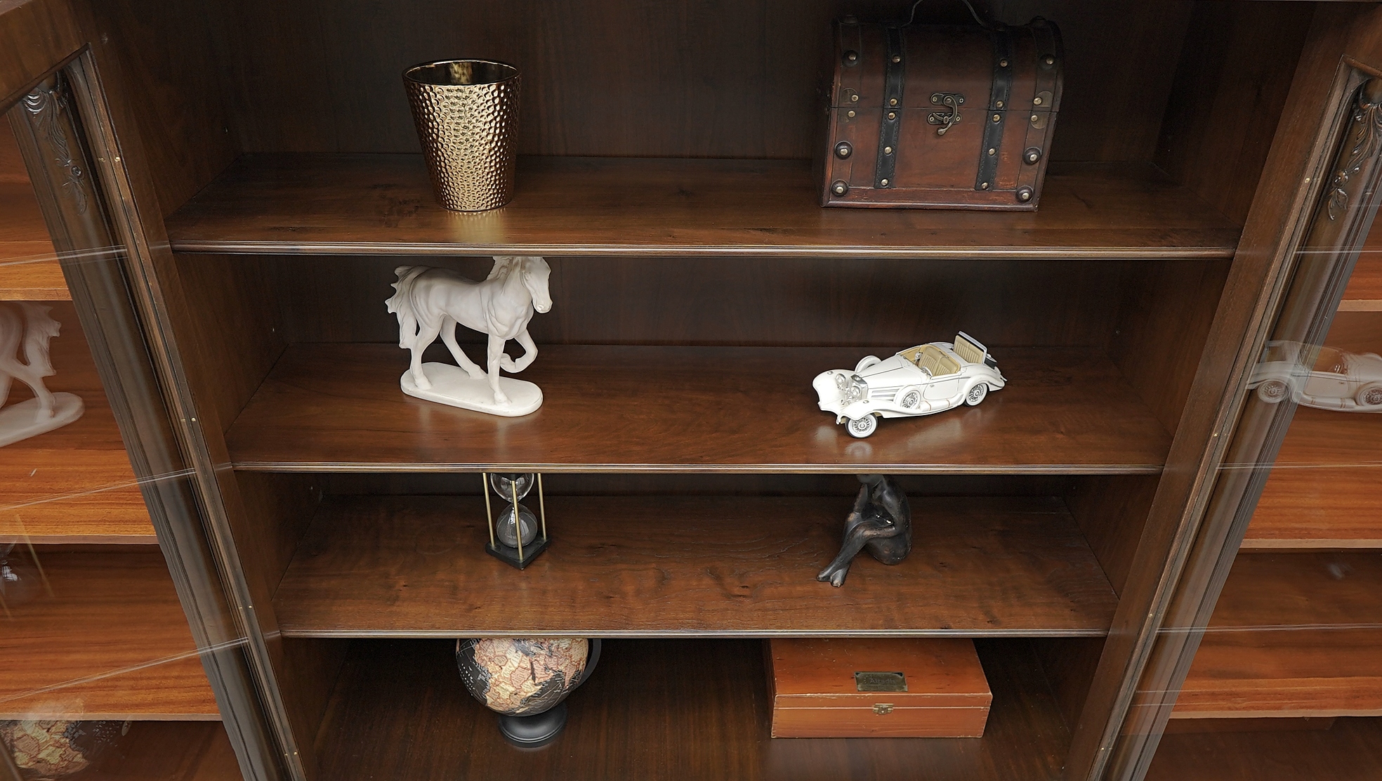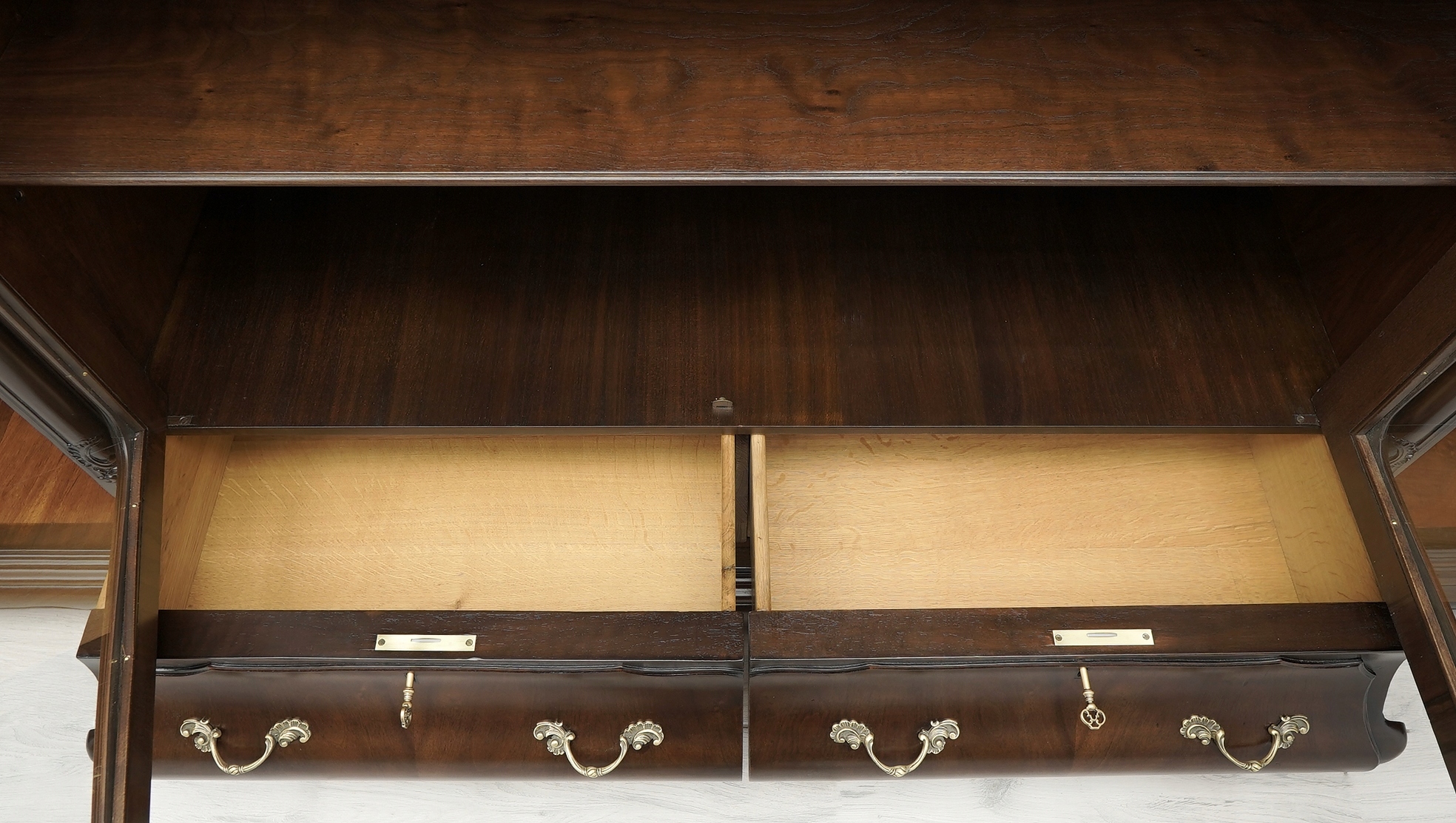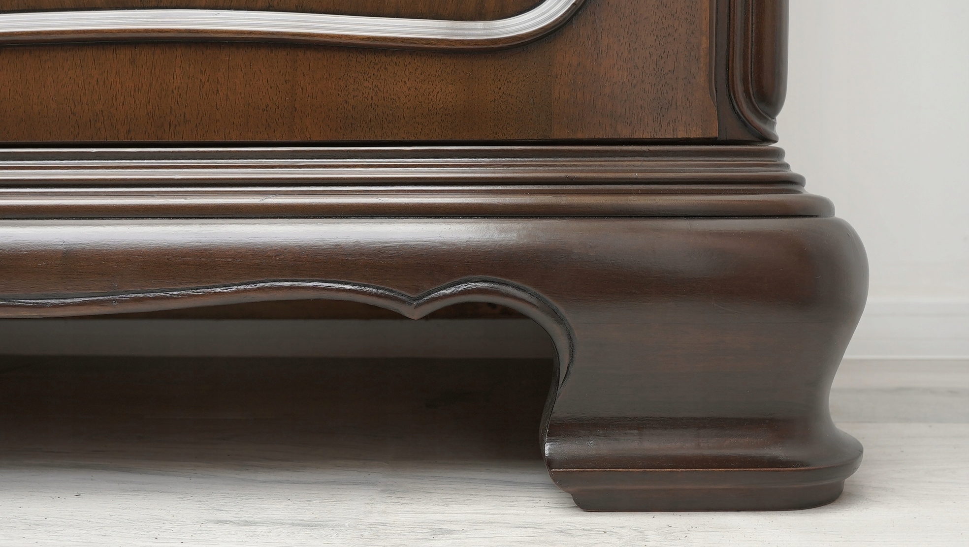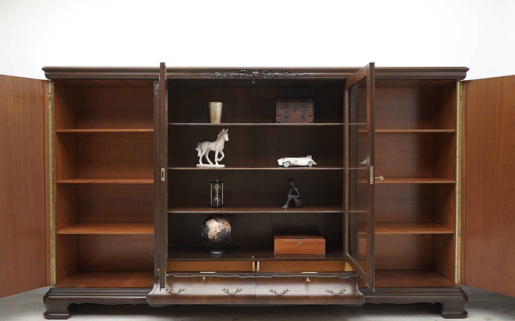Zachęcamy do jej zakupu. Jest to wyjątkowy i niepowtarzalny mebel, który urządzi każde, nawet najbardziej wymagające wnętrze. Charakteryzuje się pięknym, naturalnym usłojeniem drewna oraz bogatymi rzeźbionymi zdobieniami. Jest bardzo pojemna a dzięki dużemu przeszkleniu i złotym okuciom prezentuje się bardzo elegancko i szykownie, co nadaje jej ponadczasowego charakteru i wysokiego prestiżu.